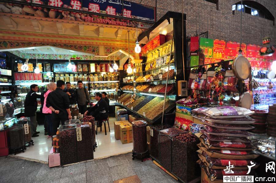 5月22日上午11點20分,游客在新疆國際大巴扎購買新疆特產(chǎn)(央廣網(wǎng)記者 張雷 攝)