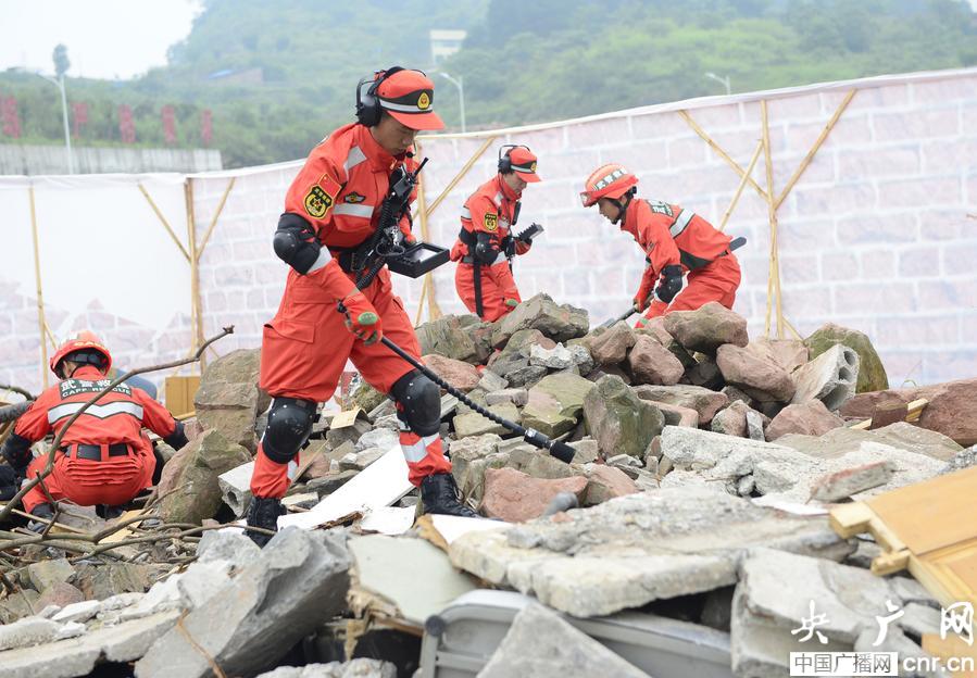 重慶武警開展應(yīng)對恐怖爆炸襲擊的救援演練(央廣網(wǎng)記者 劉湛 攝)