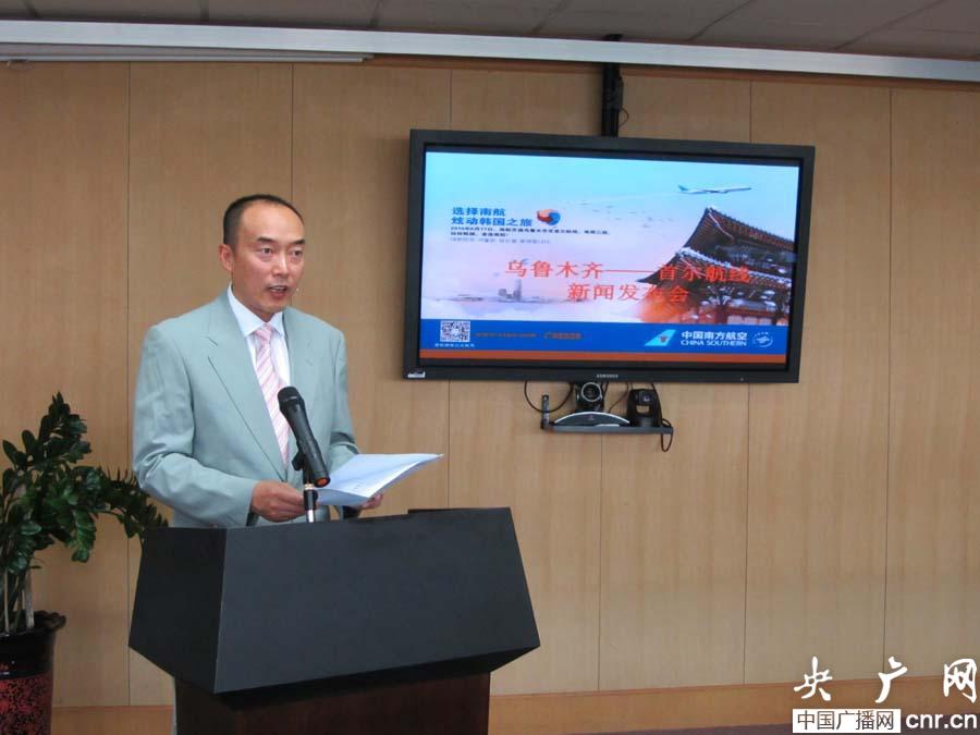 南航新疆分公司副總經(jīng)理張勝介紹新航線(xiàn)(央廣網(wǎng)記者 吳卓勝 攝)