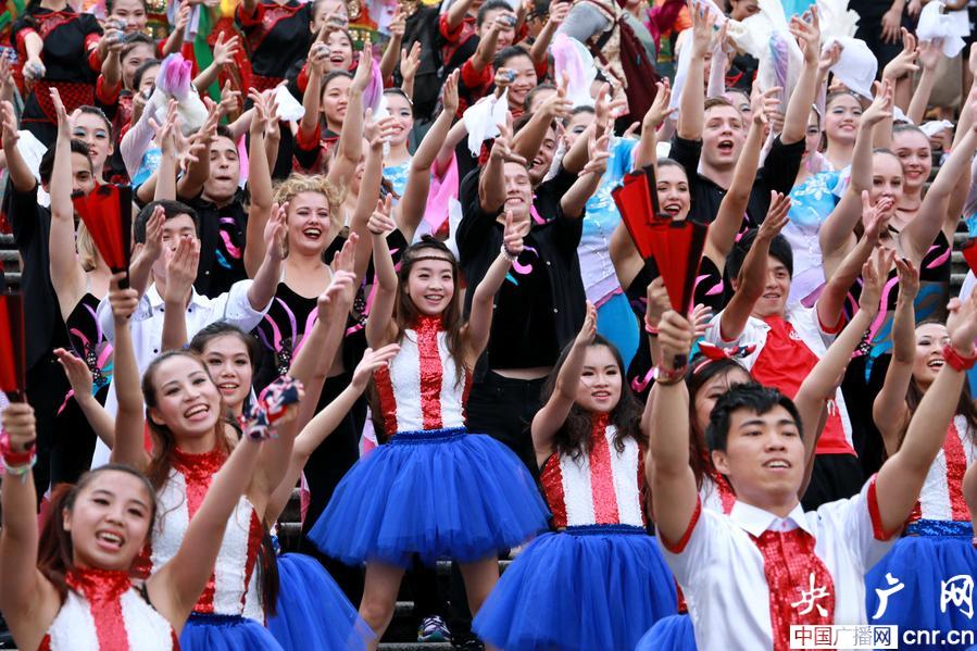 19日,澳門國際青年舞蹈節(jié)2014在大三巴牌坊舉行巡游表演,來自世界各地的25支隊伍沿著巡游路線各展才藝,與市民游客近距離接觸,為周末的澳門再添火熱氣氛。(央廣網(wǎng)記者 毛強(qiáng) 攝)