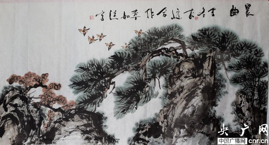 山東省女書畫家協(xié)會副主席弭金冬為災區(qū)義捐創(chuàng)作的國畫《晨曲》(央廣網(wǎng)記者 柴安東 攝)