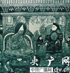 1652年,五世達(dá)賴?yán)锇⑼_桑嘉措進(jìn)京朝覲順治皇帝(壁畫)(央廣網(wǎng)記者 德慶白珍 攝)