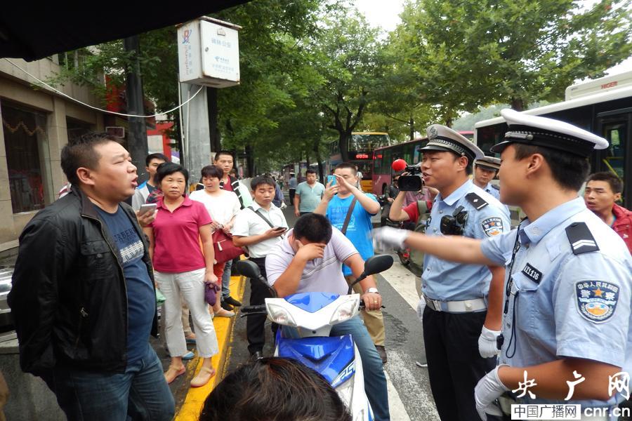 交警現(xiàn)場(chǎng)開出電動(dòng)自行車載人50元罰單。(央廣網(wǎng)記者 溫超 攝)