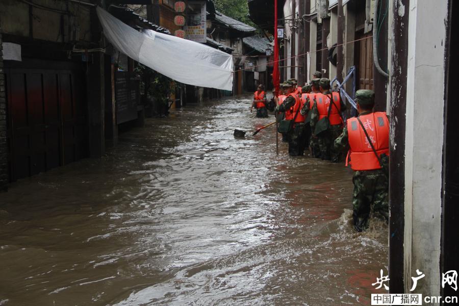 央廣網(wǎng)重慶9月13日消息(記者劉湛通訊員王洪平 謝江)今天凌晨起,重慶北碚區(qū)遭遇強(qiáng)降雨,位于金刀峽鎮(zhèn)的偏巖古鎮(zhèn)河水位上升迅猛,多處道路滑坡,位于黑灘河段的偏巖古鎮(zhèn)街道受災(zāi)嚴(yán)重,部分群眾被困,情況十分緊急。接到上級(jí)命令后,武警重慶總隊(duì)八支隊(duì)緊急出動(dòng)180名官兵趕赴現(xiàn)場搶險(xiǎn)救援。 上午13時(shí)許,官兵攜帶鐵鍬、繩索等救援器材到達(dá)偏巖古鎮(zhèn)黑水灘河段,只見平日清澈的河水已被上游沖泄下來的山洪替代,渾濁的河水不停地沖刷著河岸。根據(jù)前指命令,官兵們迅速拉起警戒線,投入警戒、疏散和搶運(yùn)物品戰(zhàn)斗。在偏巖古鎮(zhèn)街道,武警重慶總隊(duì)八支隊(duì)三大隊(duì)教導(dǎo)員楊海艦帶領(lǐng)工化救援中隊(duì)的官兵向受災(zāi)嚴(yán)重的街巷挺進(jìn),挨家挨戶進(jìn)行排查,搜尋轉(zhuǎn)移受困群眾,對(duì)滯留群眾進(jìn)行耐心地勸導(dǎo),引導(dǎo)群眾安全撤離。在金刀峽小學(xué)門前場壩,五中隊(duì)班長余現(xiàn)軍眼前幾輛摩托車即將被洪水淹沒,帶領(lǐng)5名戰(zhàn)士進(jìn)入齊腰深的水中,迅速幫助群眾搬運(yùn)搶救被淹貴重物資。 截止下午17時(shí)30分,官兵們與當(dāng)?shù)厝嗣袢罕姳娭境沙、并肩奮戰(zhàn),共轉(zhuǎn)移受困群眾450人,目前,搶險(xiǎn)救援正在進(jìn)行中。 (央廣網(wǎng)記者 劉湛 攝)