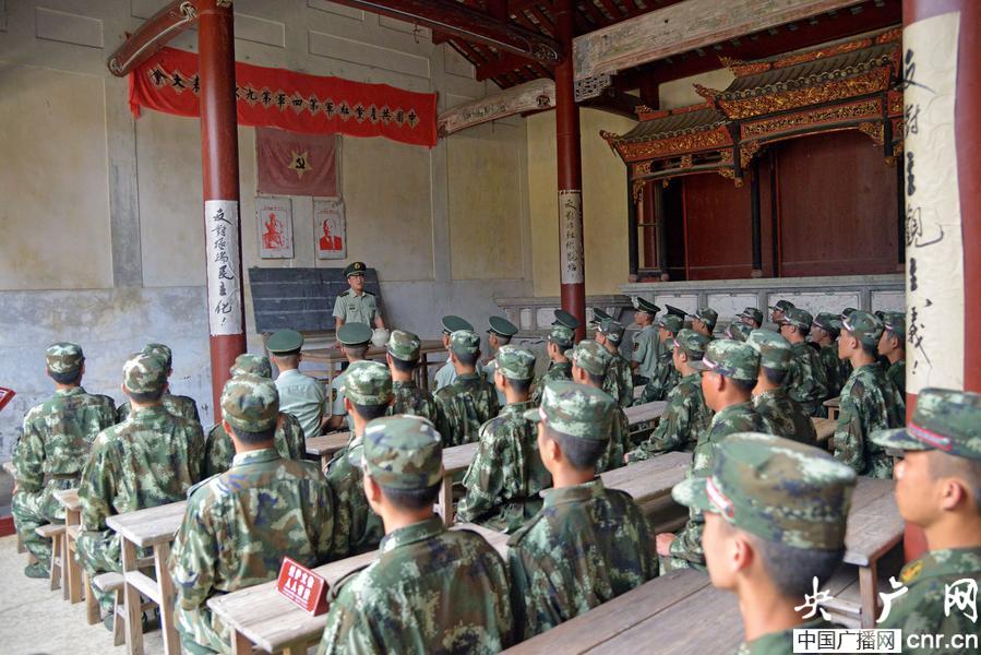 武警福建總隊龍巖支隊組織新兵在紅四軍第九次代表大會會場進行愛國主義教育。(范啟椿 攝)