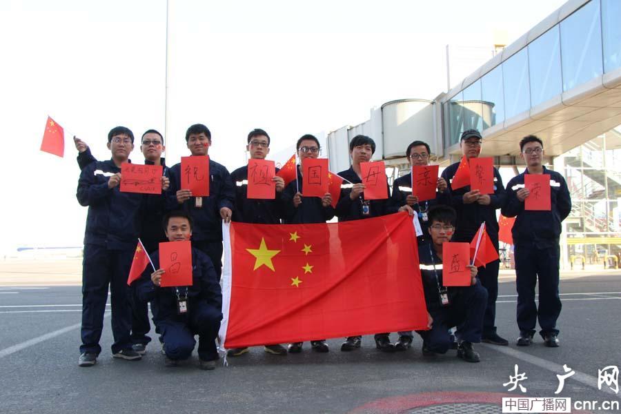 一整天的揮汗如雨,小伙子們順利完成了全部定檢任務(wù),在工作結(jié)束后,大家拿著寫(xiě)滿祝福的紅紙站在國(guó)旗下合影留念!皣(guó)慶節(jié)到了,我們會(huì)認(rèn)真做好每一架飛機(jī)客艙的檢查和維修,用最棒的客艙環(huán)境迎接旅客,用出色工作業(yè)績(jī)?yōu)樽鎳?guó)獻(xiàn)禮!”車間團(tuán)支部書(shū)記陳峰自信地說(shuō)。