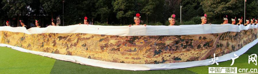 央廣網(wǎng)貴陽10月20日消息(記者孟海 郜林筱 通訊員李應該 姜澤鵬)近日,貴州省雷山縣25名苗族姑娘將一幅長33米的《清明上河圖》全景十字繡展現(xiàn)給游客觀看。