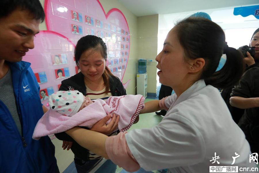 10月23日,湖南省婁底市袖珍嬰兒媽媽在婁星區(qū)婦幼保健院高興接過(guò)兒子彭安康(央廣網(wǎng)發(fā) 郭國(guó)權(quán) 攝)
