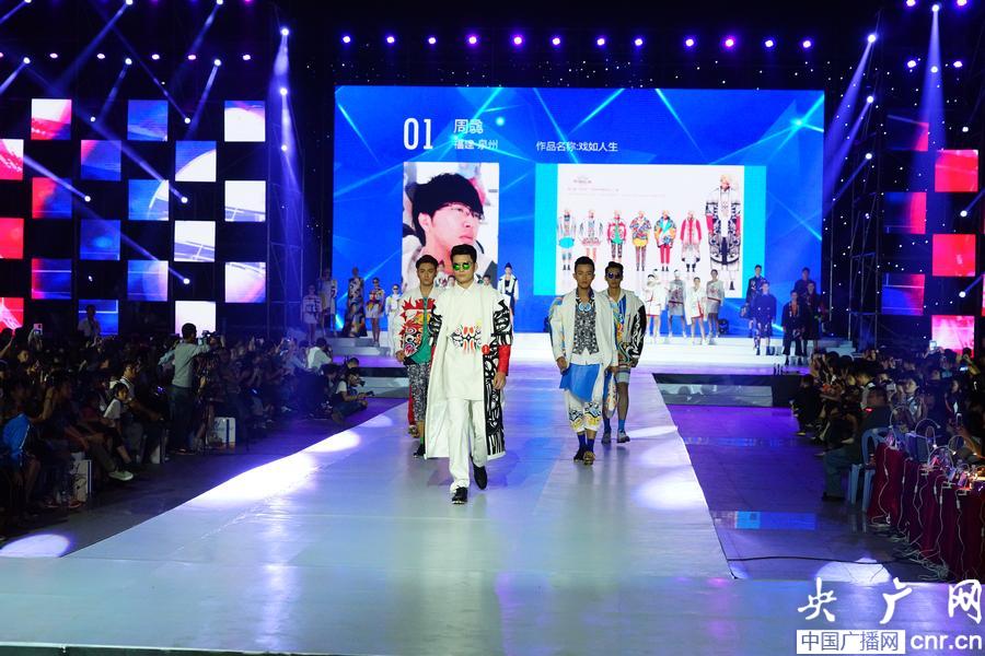第二屆“園洲杯”全國休閑服裝設(shè)計(jì)大賽金獎(jiǎng)1號(hào)周骉作品《戲如人生》(組委會(huì)提供)(央廣網(wǎng)記者 何偉奇 攝)