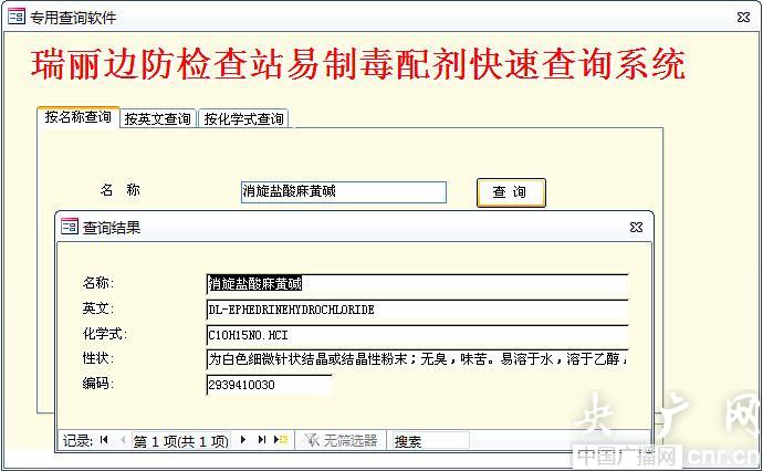 根據(jù)口岸查緝工作的需求,該系統(tǒng)共設(shè)定了按中、英文品名和化學(xué)分子式三個(gè)條件準(zhǔn)確查詢,同時(shí)考慮了因商品名稱變化而導(dǎo)致的無效查詢和錯(cuò)誤,增加模糊查詢功能,可在查詢中對(duì)近似品名的中、英文品名和化學(xué)分子式及性狀特點(diǎn)進(jìn)行列舉查詢,較好地解決了在口岸一線查緝工作人工查閱中、英文及化學(xué)分子式對(duì)照耗費(fèi)時(shí)間長、易出差錯(cuò)的問題。在該系統(tǒng)配發(fā)前臺(tái)使用后,口岸查緝效能得到了大幅提高。