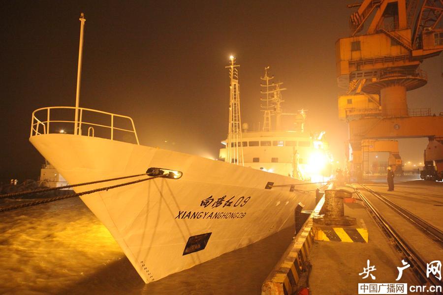22日20點(diǎn)45分,“向陽(yáng)紅09”船靠泊江陰蘇南國(guó)際碼頭。(央廣網(wǎng)發(fā)/許志攝)