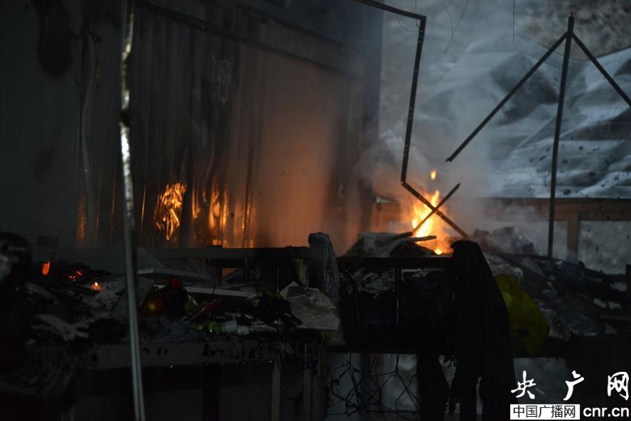 板房內(nèi)正在燃燒的民工床鋪(央廣網(wǎng)發(fā) 陳玉 攝)