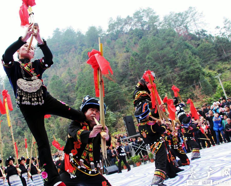 1月4日,貴州雷山南猛苗寨苗族男女用精彩的蘆笙舞慶祝全國首屆苗族蘆笙大賽。(央廣網(wǎng)發(fā) 李雪 攝)
