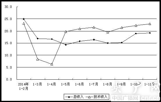 2014年1-11月中關(guān)村示范區(qū)總收入及技術(shù)收入增速圖 北京市統(tǒng)計(jì)局供圖 (央廣網(wǎng)記者 李文蕊 攝)