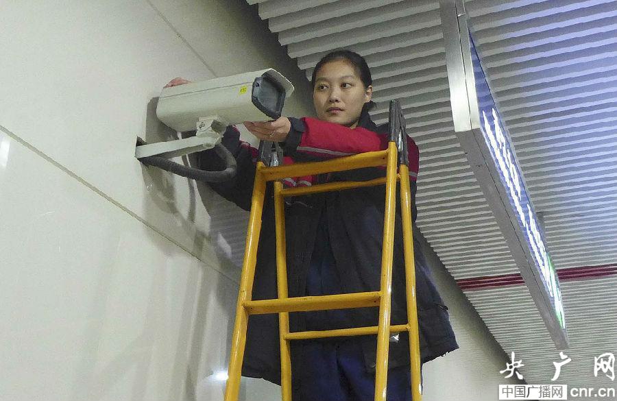 員工正在調(diào)整車站攝像機(jī) 北京地鐵供圖(央廣網(wǎng)記者 李文蕊 攝)