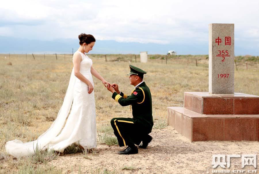 邊檢警官木拉提在界碑為愛(ài)人戴上結(jié)婚戒指(央廣網(wǎng)發(fā) 董紅太攝)