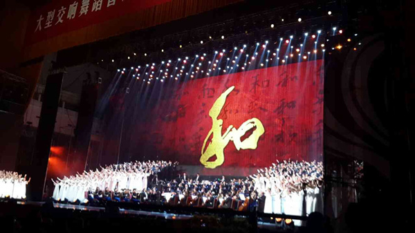 《和平頌》的音樂部分極具特色。六首原創(chuàng)歌曲、五首抗戰(zhàn)歌曲、十七段舞蹈音樂,以及大量的朗誦背景音樂,均緊扣世界反法西斯戰(zhàn)爭和中國反法西斯戰(zhàn)爭兩大主題,既突出世界各國的異域音樂風(fēng)情,又強(qiáng)調(diào)了中國民族音樂的傳統(tǒng)特色,同時各部分在藝術(shù)表現(xiàn)上達(dá)到和諧統(tǒng)一。比如,舞蹈《奧林匹克》中采了古希臘的音樂元素,以一些非常古老的、原生態(tài)的音樂素材為原型進(jìn)行藝術(shù)創(chuàng)作,體現(xiàn)出濃郁的古希臘音樂風(fēng)格。在作品的各個章節(jié)中,使用二胡、竹笛、琵琶、中阮、古箏、板鼓等中國民族樂器,展現(xiàn)中國傳統(tǒng)音樂的感染力。如第三幕,在交響樂隊(duì)的襯托下,竹笛、琵琶作為領(lǐng)奏,能讓觀眾感受到晉冀魯豫抗日根據(jù)地的濃郁地域色彩和偉大的軍民抗戰(zhàn)情懷。又如第四幕中的“水袖”,板鼓的加入,使水袖音樂更加民族化,與青衣的舞蹈更為融合,展現(xiàn)出民族音樂和民族舞蹈的特點(diǎn)。整場演出的音樂風(fēng)格變幻,卻能夠保持藝術(shù)表現(xiàn)的和諧統(tǒng)一。