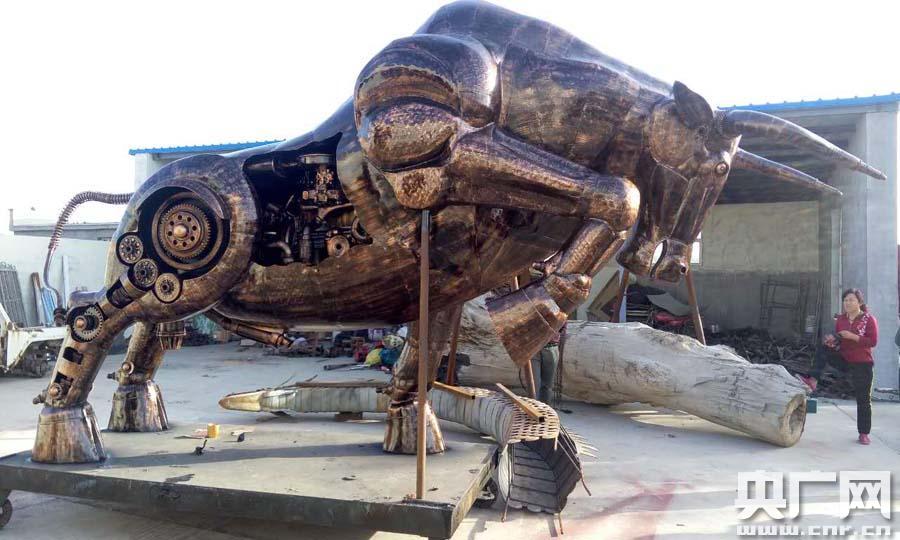 提及設(shè)計初衷和制作過程,景逸雕塑負責(zé)人許高鵬告訴記者:“因為我們知道江蘇華西村有一個金牛,美國華爾街也有一個牛。我們想呼圖壁縣本來就是中國牛鄉(xiāng),以牛這個主題,我們討論了一下,最后定下來就是一種拓荒牛的造型。完了之后我們就去廢品收購站買了許多廢鐵,廢鋼板之類的材料。從牛蹄開始,所有的鋼板都是我們用手工用榔頭一下一下敲出來的。當(dāng)時就想用廢舊零件去做,一方面是廢物利用,一方面是節(jié)能環(huán)保!