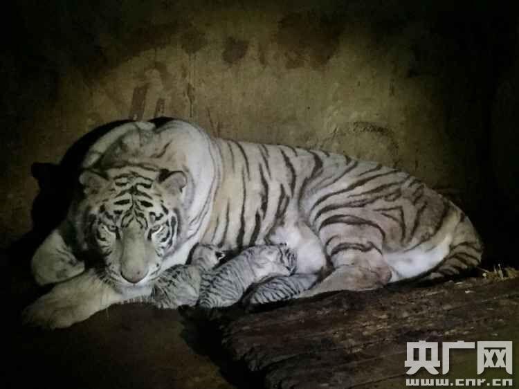 25日凌晨,這只白虎就顯得焦躁不安,不斷在虎舍里踱步,一個(gè)小時(shí)后白虎媽媽身體弓著,不斷用力抖動(dòng),不一會(huì),虎媽媽的身下冒出一灘血,第一只小老虎像一個(gè)肉球一樣出來了;寢層米ψ訉⒒⑨虛艿搅俗约旱拿媲,將小老虎身上的胎衣弄破,用舌頭將小老虎身上的羊膜和羊水一點(diǎn)一點(diǎn)的舔干凈。值班飼養(yǎng)員和獸醫(yī)一直在旁觀察著虎媽媽的狀況。由于白虎媽媽先前生過3次寶寶,所以相當(dāng)有“經(jīng)驗(yàn)”,2個(gè)小時(shí)就把寶寶全部生下來了。記者從飼養(yǎng)員那里了解到,這5只小老虎生下來的時(shí)候身體健康良好,沒多大一會(huì)兒就吃上了母乳。