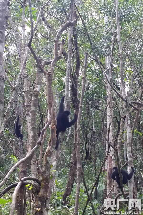 棧道傍,前來徒步參觀的王小姐與在林間跳蕩穿越的長臂猿不期而遇,而這樣的邂逅令她感到很幸福。她說:“看見動物一種很自然的生長狀態(tài),不僅放松了身心,也長了很多知識,這樣也會觸發(fā)我們對大自然更深的熱愛!