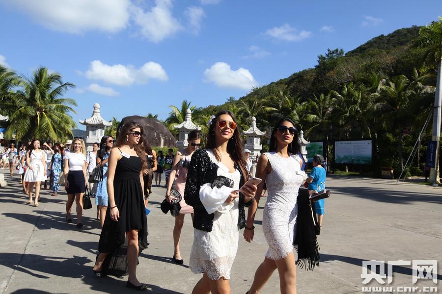 在南山景區(qū),佳麗們乘坐“小火車”游覽了海上觀音、南山寺、金玉觀音、三十三觀音堂等景點(diǎn)。佳麗們有說有笑,還時不時拿出手機(jī)自拍留念。佳麗們高挑的身材十分搶眼,每到一處都會引來眾多游人圍觀拍照,她們也十分隨和,并熱情的用中文“你好”向游客打招呼。