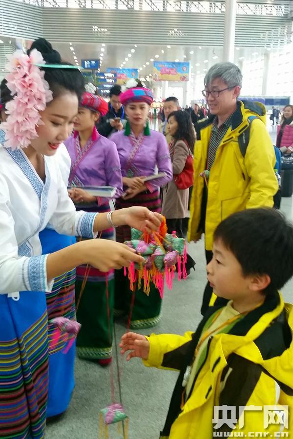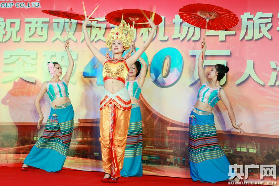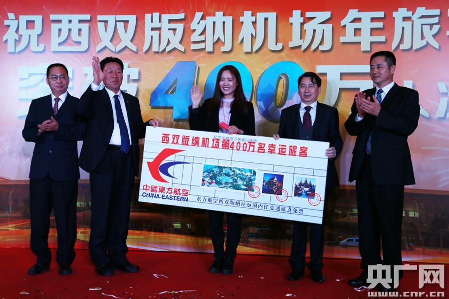 央廣網(wǎng)西雙版納12月22日消息(記者李健飛)2015年12月22日上午9時,在東航2577出港航班中,來自內(nèi)蒙古赤峰市的姚紅雪幸運(yùn)的成為了云南西雙版納機(jī)場今年的第400萬名旅客。至此,西雙版納機(jī)場年旅客吞吐量首次突破400萬人次。在當(dāng)天的現(xiàn)場慶;顒又,西雙版納機(jī)場開展了與旅客互動、抽獎、微信搖一搖促銷活動,并為旅客呈獻(xiàn)民族風(fēng)情的歌舞表演。