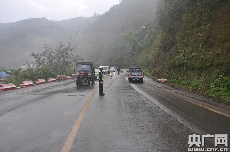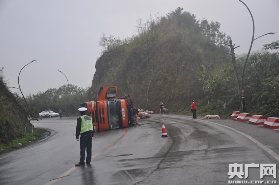 當(dāng)天清晨,瀾滄縣公安局交警大隊惠民中隊民警驅(qū)車在轄區(qū)進(jìn)行巡邏,當(dāng)巡邏到西景線K3012處時,發(fā)現(xiàn)一輛翻倒的重型貨車占據(jù)了道路中央,一頭頭生豬在道路上四下奔跑,嚴(yán)重影響了道路交通秩序,驚魂未定的貨車駕駛員付某站在一旁手足無措。經(jīng)詢問,付某駕駛著載滿161頭生豬的重型貨車從景洪市向瀾滄縣方向行駛,當(dāng)行駛至西景線K3012處在下坡轉(zhuǎn)彎過程中,因道路濕滑,車輛控制不穩(wěn),導(dǎo)致車輛沖出路面后與山墻發(fā)生碰撞,致使車輛翻倒在道路中間。