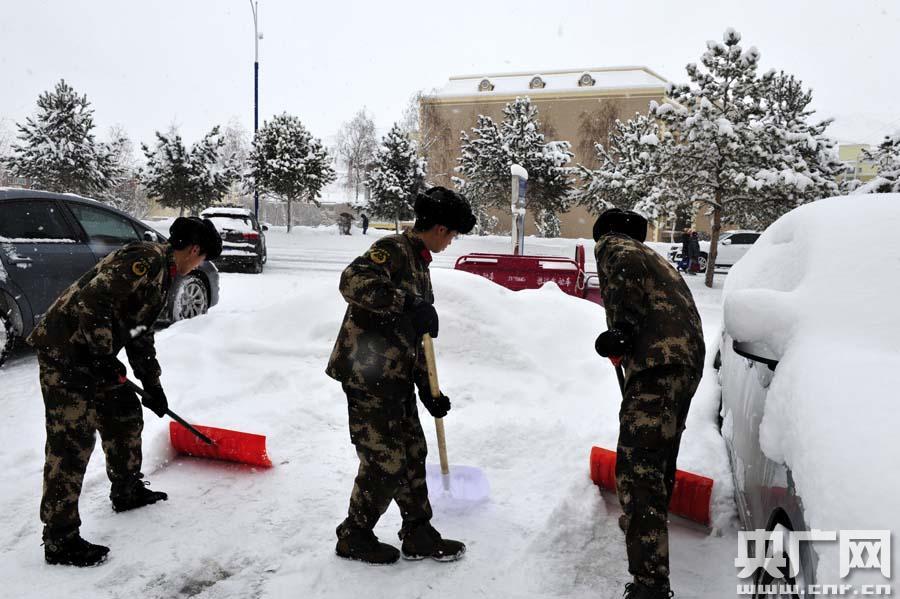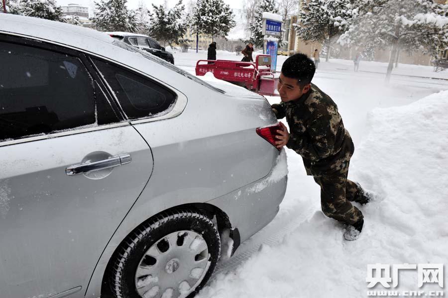 阿勒泰市公安消防大隊?wèi)?zhàn)士周杰說:“連續(xù)兩天都在下雪,尤其今天雪下的比較大,。們及時出來幫市民清理積雪、推車,方便市民出行。”
