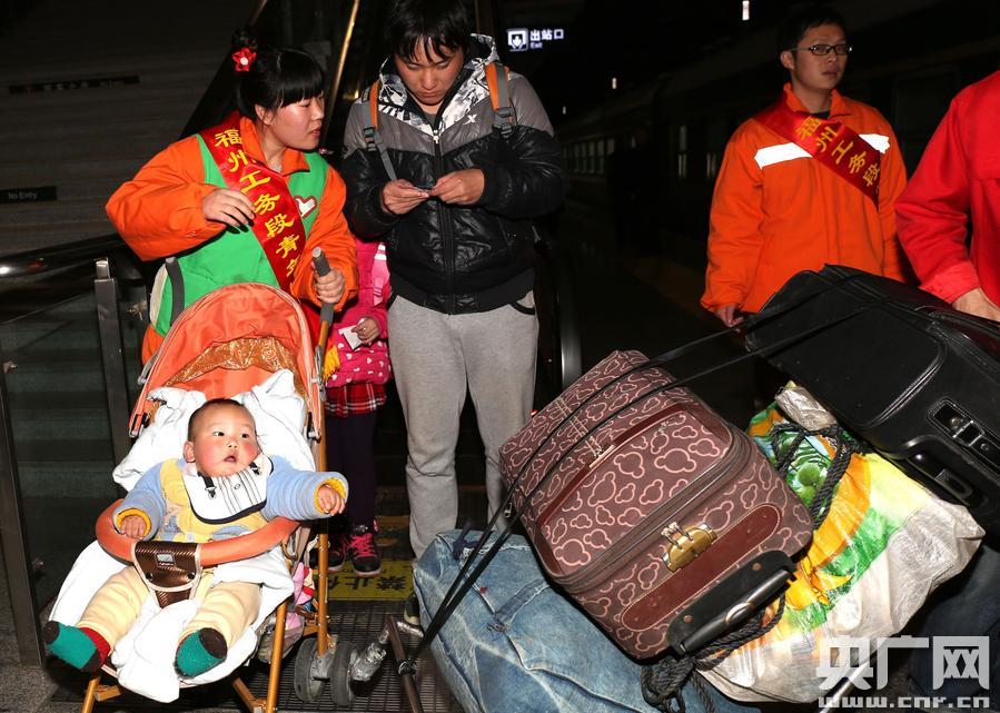 央廣網(wǎng)福州1月27日消息(記者 葛朝興 通訊員 雍萬俊 許建勝 )“他們就像閃爍著火焰的桔燈溫暖著我們的回鄉(xiāng)路”。1月26日晚8時,福州開往達州K4382次列車?吭诟V莼疖囌1號站臺,當進站的閘門拉開,乘車的旅客如同滾滾洪流奔騰著,在奔騰的洪流中有群身穿桔黃色防護服務身披綬帶的青年在人群中來回穿梭著,他們或是幫助重點旅客扛行李或是幫助旅客照顧孩子,讓歸心似箭的旅客在極寒的返鄉(xiāng)途中多了幾分溫暖,他們就是南昌鐵路局福州工務段黨團員志愿者服務隊的青年。