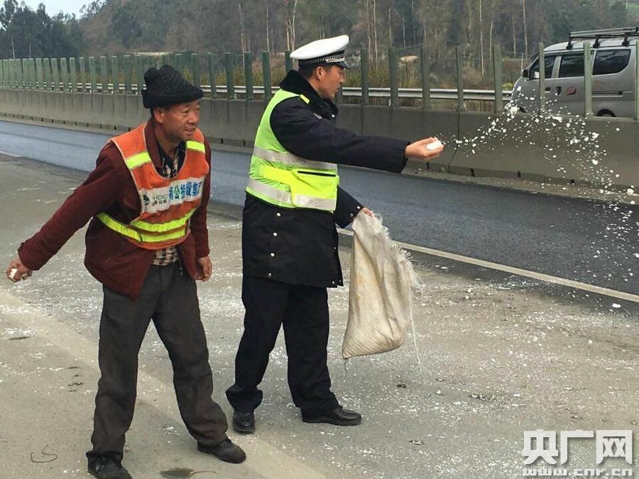 目前,保山公安各級(jí)交警部門(mén)民警、協(xié)管員不間斷對(duì)結(jié)冰路段、大霧路段、長(zhǎng)下坡路段進(jìn)行24小時(shí)監(jiān)控,并督促工作人員按時(shí)撒融雪劑,確保路面零結(jié)冰;不間斷巡邏清理故障車、違停車,值守路面加強(qiáng)車輛指揮疏導(dǎo)保障行車安全。僅27日當(dāng)天,保山全市共受理報(bào)警、咨詢618次,就近調(diào)派警力處置群眾求助類警情110次,成功處置事故現(xiàn)場(chǎng)14起,成功處置收費(fèi)站堵路警情1起,預(yù)防了二次碰撞事故和長(zhǎng)時(shí)間長(zhǎng)距離交通擁堵。