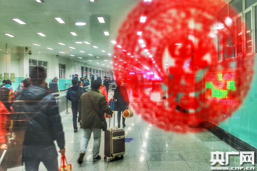 2月7日晚上20時,透過烏魯木齊南站進(jìn)站通道的新年窗花看到,雖然已是除夕,坐火車出行的旅客依然不少。當(dāng)日,烏魯木齊站累計發(fā)送旅客3.7萬人,較去年同期增長13%。(央廣網(wǎng)記者 何微 攝)