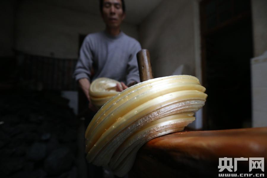 情人節(jié)的頭一天,晉寧縣晉城鎮(zhèn)回龍村丁少明家里,上百斤糙米已經(jīng)淘洗干凈。丁少明一桶一桶抄起倒進蒸籠,妻子則站在齊腰深的灶堂坑道里,鏟起一鏟子煤炭送進灶爐;饎轁u旺,直徑四尺二的鐵鍋開始往上蒸發(fā)騰騰熱氣。米飯蒸熟后,要加入麥芽糖自然發(fā)酵。經(jīng)過一段時間發(fā)酵,等米飯滲出糖水,再將糖水加熱,蒸發(fā)掉多余的水分,便成了色澤金黃的晴糖。當晴糖冷卻至溫熱、柔軟程度剛好時,將其盤在木樁上不斷拉伸,重疊,再拉伸,再重疊,如此反復數(shù)次,晴糖內(nèi)充滿氣泡,色澤也從金黃變成米白。