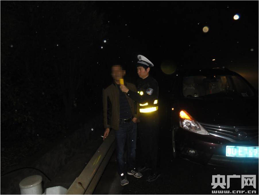 民警在對(duì)駕駛?cè)送跄尺M(jìn)行呼氣酒精含量測試(警方供圖)