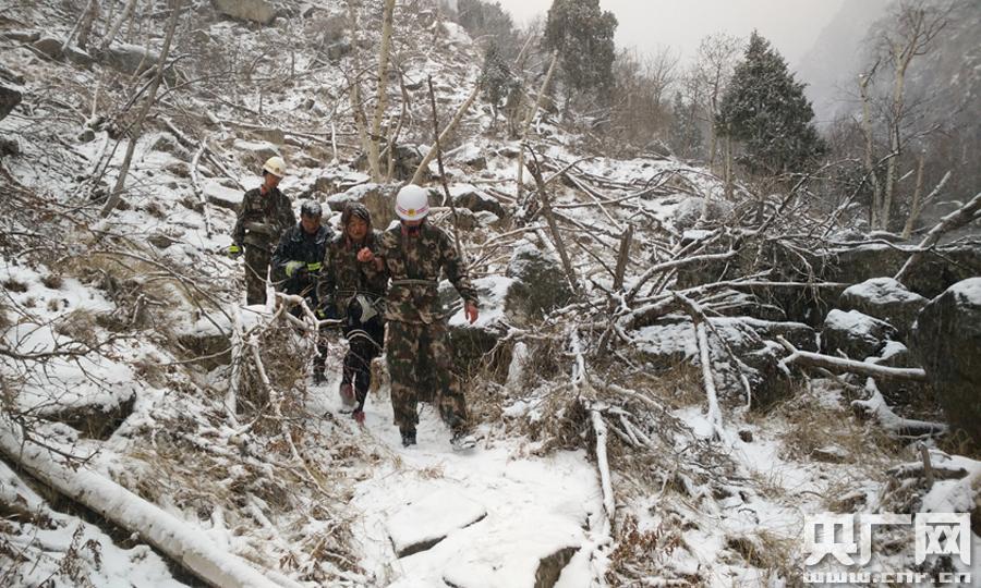 晚上10時多消防官兵抵達(dá)滾鐘口賀蘭石礦山腳下,通過詢問得知,被困人員位置較遠(yuǎn),山路崎嶇。由兩名景區(qū)巡山人員領(lǐng)路,救援官兵深入山中進(jìn)行救援,并分成兩組進(jìn)行找尋。但由于深夜無法確定被困人員位置, 今日凌晨,7名救援官兵攜帶救援器材再次與巡山人員進(jìn)山救援。上午11時確定被困者位置,12時找到了被困十多個小時的兩名被困人員。在下山的途中突然下起了大雪,山路被雪覆蓋,在利用安全繩互相牽引下試探一點(diǎn)一點(diǎn)往山下撤離。經(jīng)過連續(xù)8個多小時的艱苦救援,下午2時40分,兩名被困人員被成功救下山,身體并無大礙。