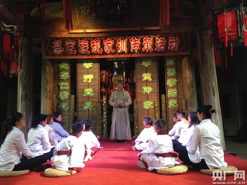 “睦宗親,親鄰里,篤孝思,重嚴慈……”蔡宅村文化禮堂的族規(guī)家訓館,館內(nèi)傳出孩子們朗朗的誦讀聲,這是當?shù)卣谂e行“族規(guī)家訓”文化傳承活動。