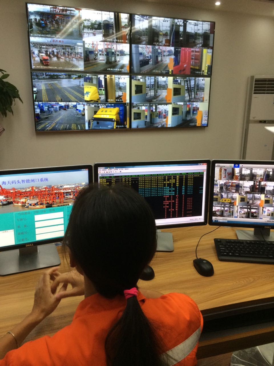 工作人員在利用廈門港集裝箱智慧物流平臺控制調(diào)度碼頭閘口箱車進出