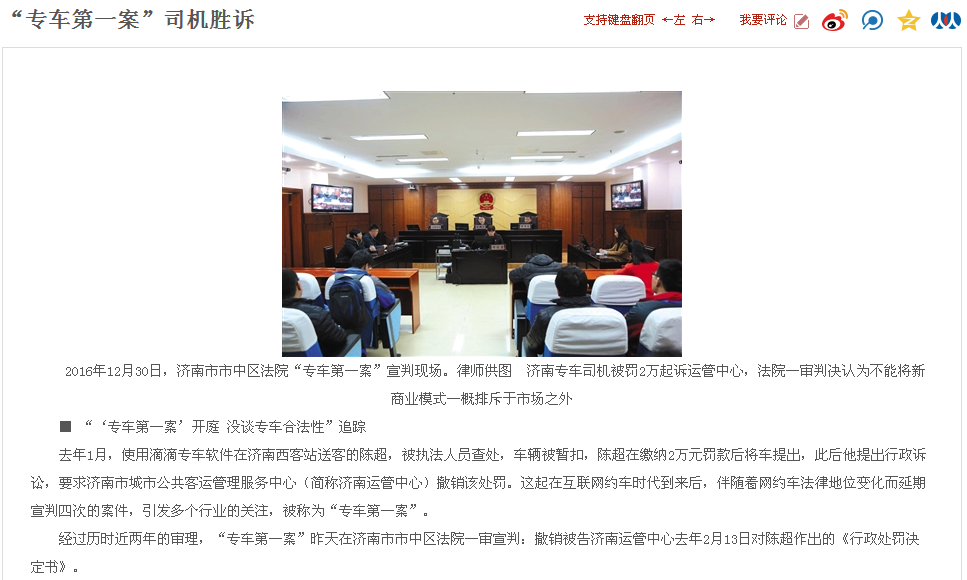 央廣網(wǎng)濟(jì)南1月16日消息(記者劉穎超)備受關(guān)注的全國“專車第一案”又有新進(jìn)展。1月13日,山東省濟(jì)南市市中區(qū)人民法院通過官方微博發(fā)布公告:原告陳超訴被告濟(jì)南市城市公共客運管理服務(wù)中心行政處罰一案,一審宣判后,被告濟(jì)南市城市公共客運管理服務(wù)中心于法定上訴期內(nèi)向本院遞交上訴狀,已上訴于濟(jì)南市中級人民法院。
