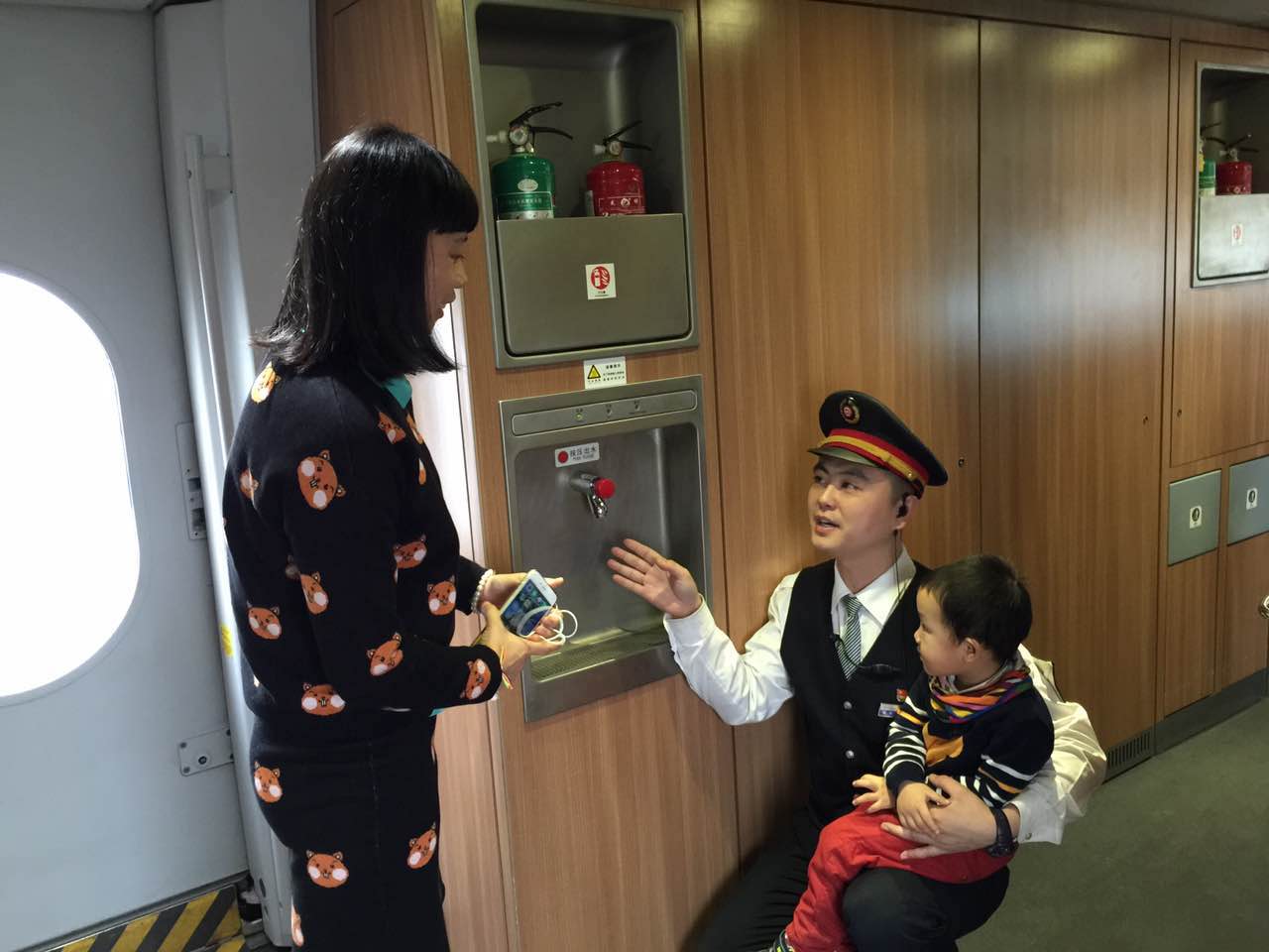 抓起半溫不熱的饅頭剛啃了兩口,陳科的對講機再次響起,這次,是七號車一位到煙臺的旅客需要輪椅。來到七號車,陳科先幫這位行動不便的旅客調(diào)了一個靠近廁所的座位,又向陪同人員囑咐了一些注意事項,然后給煙臺站打電話聯(lián)系了輪椅,并特意叮囑一位男乘務(wù)員到站時過來搭把手。