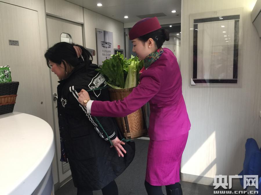 2月18日,家住資中的羅女士乘坐10點(diǎn)11分途經(jīng)資中北站的G8508次列車到成都看望兒子?粗龜y帶滿滿一背簍的新鮮蔬菜,乘務(wù)員立即搭手幫她取下,乘務(wù)員熱心的幫忙,讓羅女士侃侃而談!艾F(xiàn)在你們這高鐵太方便了,我以前坐大巴要兩個(gè)多小時(shí),現(xiàn)在坐高鐵半個(gè)多小時(shí)就到了!我上午從資中買的菜,中午就可以拿到成都做午飯了,真好!”