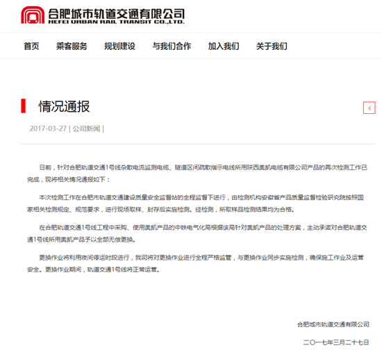 央廣網(wǎng)合肥3月28日消息(記者徐鵬)日前,針對(duì)合肥軌道交通1號(hào)線雜散電流監(jiān)測(cè)電纜、隧道區(qū)間疏散指示電線所用陜西奧凱電纜有限公司產(chǎn)品的再次檢測(cè)工作已完成。3月27日傍晚,合肥城市軌道交通有限公司在其官方網(wǎng)站發(fā)布《情況通報(bào)》: