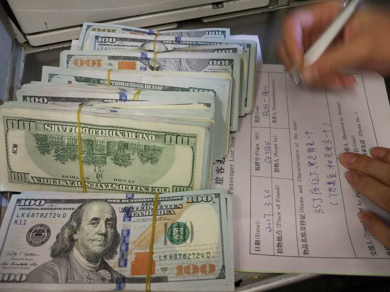 CZ3564飛機(jī)23點20分航班落地,執(zhí)行該航班的機(jī)長是周皓然,乘務(wù)長是魏榕、安全員是徐致遠(yuǎn)。航班凌晨落地后,乘務(wù)組正常執(zhí)行服務(wù)程序,并按規(guī)定在送客階段做好提醒旅客攜帶好隨身物品的廣播工作,旅客下機(jī)后,乘務(wù)組逐排清艙的過程中,00:00左右,乘務(wù)員宋海賓在35J座位下發(fā)現(xiàn)黑色背包一個,他立刻上報乘務(wù)長,組員和安全員一起清點后發(fā)現(xiàn)包內(nèi)有現(xiàn)金7萬美金、30元人民幣和充電寶一個。