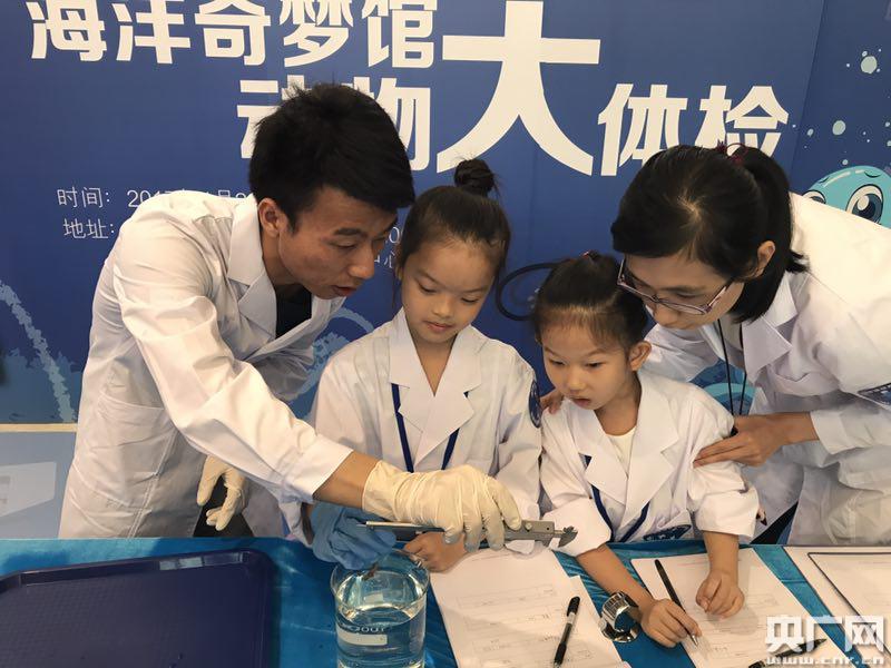 在海洋館工作人員的帶領(lǐng)下,三名小小體檢員認真地記錄數(shù)據(jù)。
