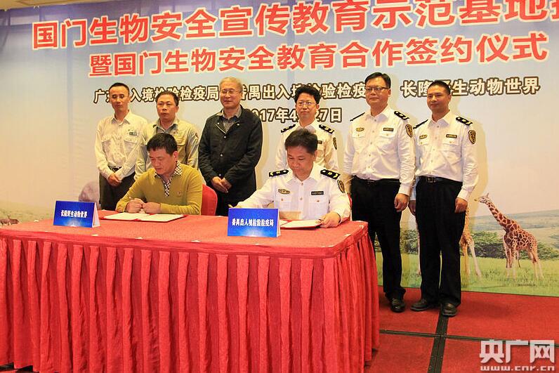 根據(jù)國(guó)門(mén)生物安全教育合作協(xié)議內(nèi)容,廣東檢驗(yàn)檢疫局和長(zhǎng)隆野生動(dòng)物世界將共同做好外來(lái)有害生物及外來(lái)動(dòng)植物疫情疫病防控,保障種質(zhì)資源安全引進(jìn),為國(guó)家生物多樣性發(fā)展戰(zhàn)略服務(wù);加強(qiáng)外來(lái)動(dòng)植物疫情疫病防控的信息交流和科研合作,開(kāi)展外來(lái)動(dòng)植物疫情疫病防控政策法規(guī)培訓(xùn)及疫病防控應(yīng)急演練;每年聯(lián)合開(kāi)展國(guó)門(mén)生物安全教育活動(dòng),在景區(qū)部分動(dòng)物表演中增加國(guó)門(mén)生物安全倡議內(nèi)容,聯(lián)合制作國(guó)門(mén)生物安全知識(shí)宣傳展板、宣傳手冊(cè)在景區(qū)陳列,向景區(qū)游客等宣傳國(guó)門(mén)生物安全知識(shí)等