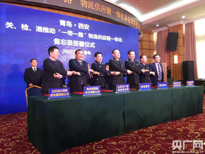 青島海關(guān)、西安海關(guān),山東出入境檢驗(yàn)檢疫局、陜西出入境檢驗(yàn)檢疫局,青島港、西安國(guó)際港務(wù)區(qū)及中鐵聯(lián)合國(guó)際集裝箱有限公司七方共同簽署推動(dòng)“一帶一路”區(qū)域物流供應(yīng)鏈一體化倡議。提出要推動(dòng)實(shí)現(xiàn)海鐵聯(lián)運(yùn)、海陸聯(lián)運(yùn)、空鐵聯(lián)運(yùn)等多種運(yùn)輸方式無(wú)縫銜接和資源共享。圍繞國(guó)際物流供應(yīng)鏈,打造一體化物流服務(wù)平臺(tái),整合信息數(shù)據(jù)資源,建立“業(yè)務(wù)協(xié)同、信息共享”的物流服務(wù)機(jī)制,培育發(fā)展服務(wù)“一帶一路”的大型物流企業(yè)集團(tuán),提升現(xiàn)代物流業(yè)服務(wù)能力和水平。