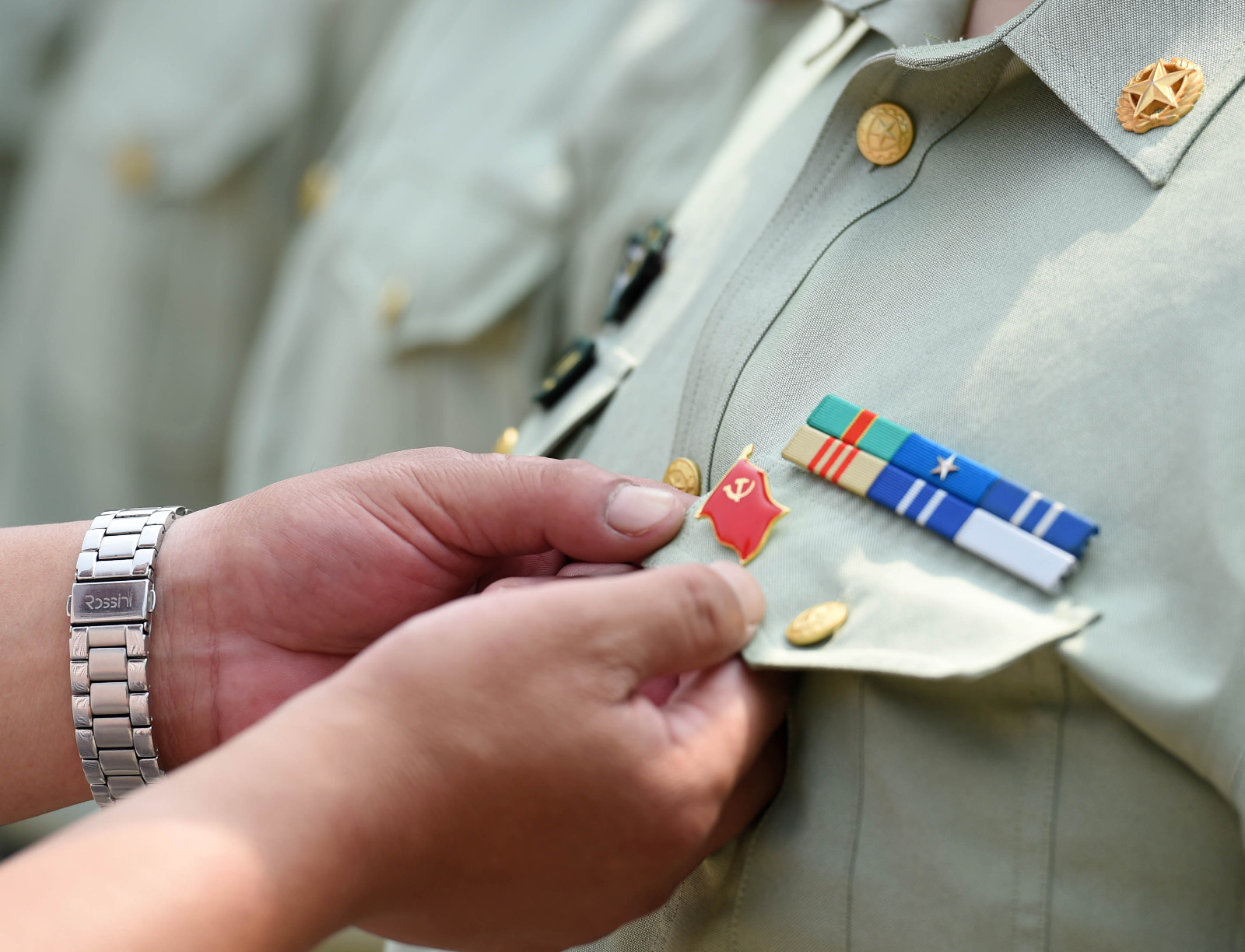 6月30日,在煙臺山革命烈士紀(jì)念碑旁,30年黨齡的李國榮老黨員給新入黨的邊防戰(zhàn)士佩戴黨徽。