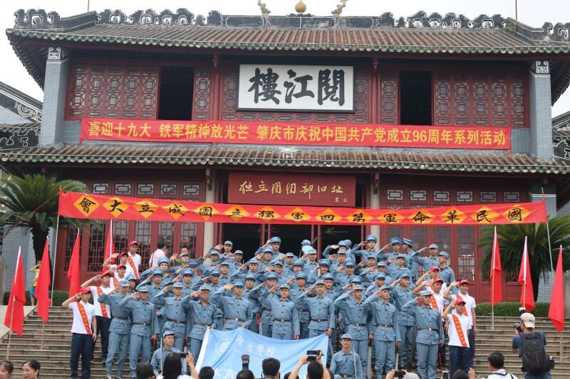 本次活動中,100名少先隊員在現(xiàn)場合唱《沒有共產(chǎn)黨就沒有新中國》,用歌聲學(xué)習(xí)先烈的革命精神,牢記先輩們的艱苦奮斗;100名肇慶學(xué)院的學(xué)生扮演“葉挺獨立團(tuán)”戰(zhàn)士,在軍號聲中出場,通過操練、隊列等方式在現(xiàn)場實景再現(xiàn)了出師北伐的故事;由肇慶市委組織部和市直工委組織的100名黨員,身穿紅色黨員志愿者服裝,在主持帶讀下,重溫入黨誓詞,籍此促使每個黨員堅定理想信念,不忘初心、繼續(xù)前進(jìn)。