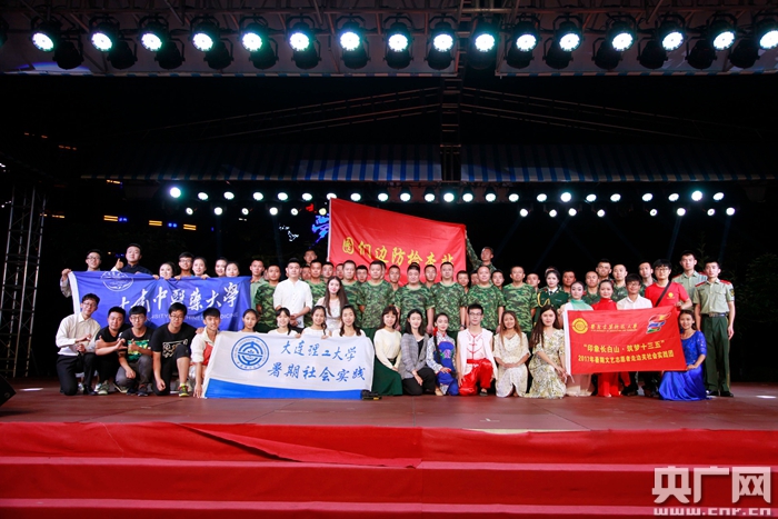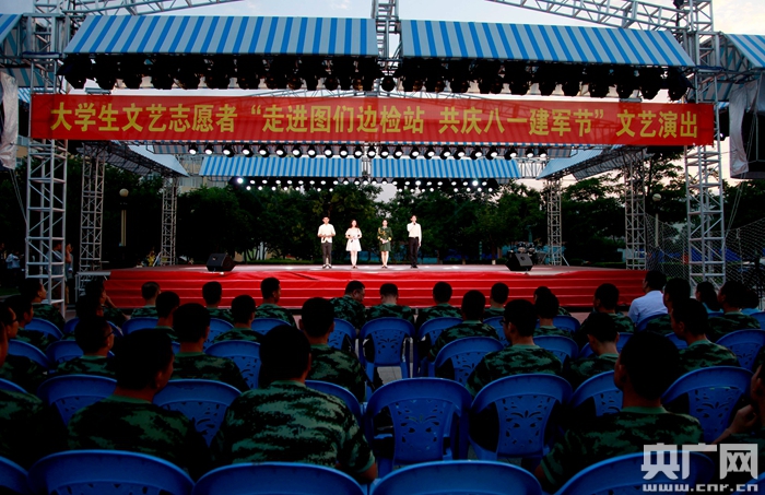央廣網圖們8月1日消息(記者晁向榮 通訊員張彪)7月31日晚,大學生文藝志愿者“走進圖們邊檢站 共慶八一建軍節(jié)”文藝演出在吉林省圖們市的圖們江廣場隆重舉行。來自甘肅中醫(yī)藥大學、大連理工大學以及西安建筑科技大學的30名大學生文藝志愿者為官兵們奉上一場精彩的演出,圖們邊檢站、延邊邊防支隊機動大隊二中隊官兵及駐地群眾共計500余人觀看演出。