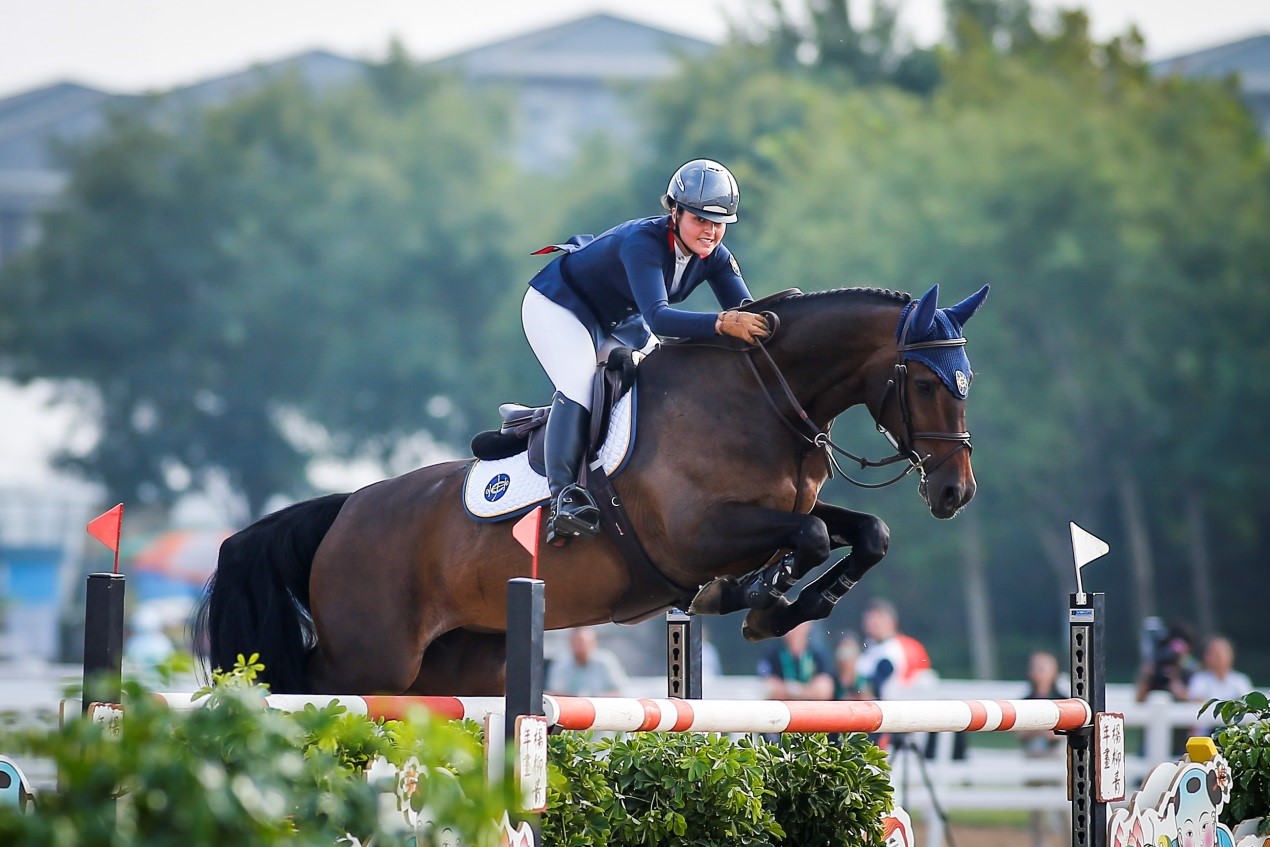 在場(chǎng)地障礙個(gè)人賽中,黎嘉怡與20名騎手同場(chǎng)較量。兩輪比賽包括需要跨越1.45至1.55米高的欄障,黎嘉怡發(fā)揮出色,以12個(gè)罰分,與另外四名騎手進(jìn)入附加賽,最終撃敗其他騎手,贏得一面銅牌。