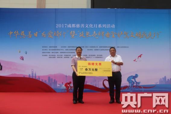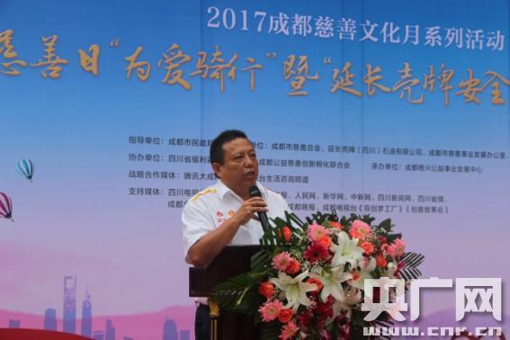 成都市民政局副巡視員宋本收致辭(央廣網記者 韓民權 攝) 央廣網9月7日消息(記者韓民權) 為愛騎行,安全護駕,傳遞大愛。9月5日,中華慈善日“為愛騎行”暨“延長殼牌安全護駕文明我先行”活動在成都舉行,4支隊伍為愛騎行15公里,為“中華慈善日”、“99公益日”開展宣傳。 成都市民政局副巡視員宋本收在活動中表示,今年“中華慈善日”,通過“綠色宣傳+慈善倡導”的公益方式吸引社會愛心人士關注,對于推動和共建“互聯網+”公益新生態(tài),多元化踐行企業(yè)社會責任,傳遞企業(yè)社會價值,動員社會力量募捐籌款,實現全新的跨界全民公益模式起到了積極的作用。 隨后,參與為愛騎行的全體成員在啟動儀式現場進行了亮相并展示隊伍口號,宋本收副巡視員同延長殼牌副總經理姚遠共同啟動騎行出征儀式。 經過近一個小時的騎行,各團隊都完成了15公里的目標。據悉,在10月下旬還將舉行一年一度的“為愛行走·成都站”活動。 活動現場還舉行了延長殼牌(四川)石油有限公司向成都市慈善總會捐贈儀式。 -