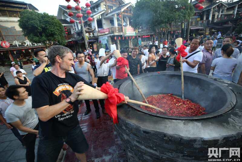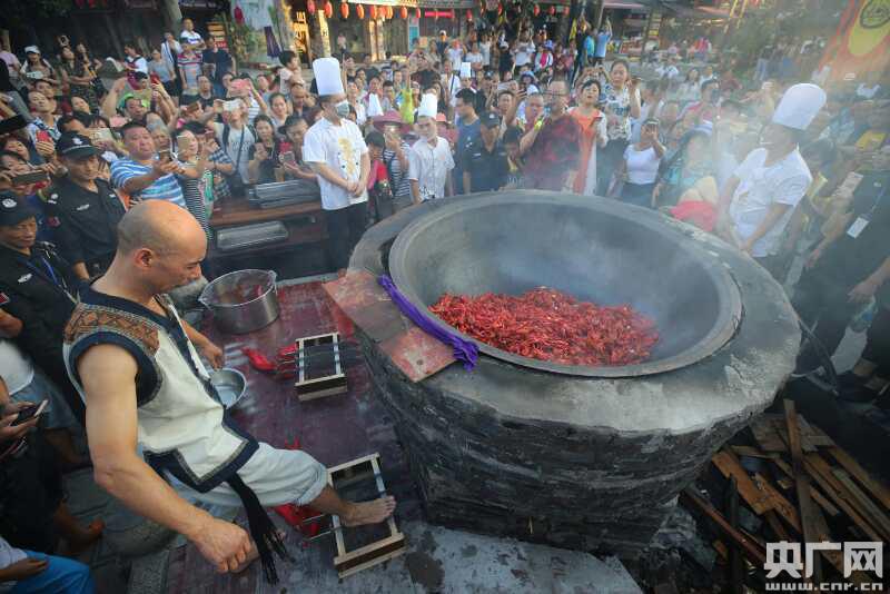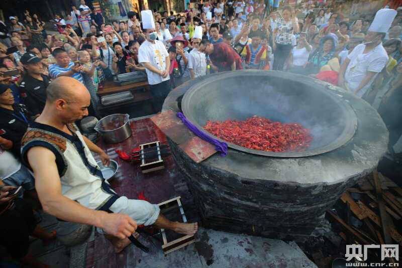 2017年9月26日,在張家界市武陵源區(qū)非遺體驗(yàn)基地溪布老街民間藝人唐承剛雙腳踩在鋒利的刀刃上,徒手在直徑2米、溫度近260度的油鍋里炒龍蝦。